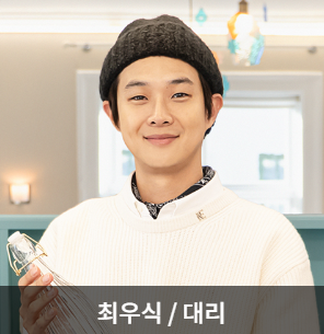 - 최우식(대리) : 이번에 승진하여 인턴에서 대리를 달았고 셰프로 데뷔도 했습니다. 최우식 만의 유머러스한 멘트와 제스처가 프로그램의 재미를 더해준다고 생각합니다. 다른 출연진들과의 케미도 좋고 모두에게 친하게 지내는 모습을 보며 성격 자체가 좋은 사람이라고 생각합니다.